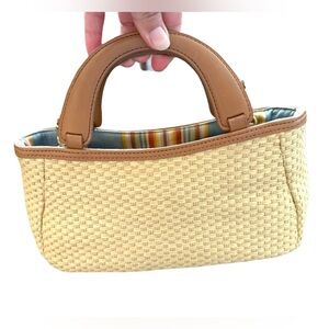Small straw Fossil Handbag with detachable shoulder straps. Beautiful striped lining with pocket. Bag has a magnetic top closure.