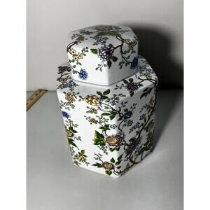 This is a Classic Galt Lidded Ginger Jar featuring a vibrant Chinoiserie-style floral pattern with colorful blossoms, branches, and greenery. Made from porcelain with a glossy glaze, the jar has a hexagonal shape and a snug-fitting lid. It’s a lovely decorative piece perfect for display on shelves, mantels, or entry tables.