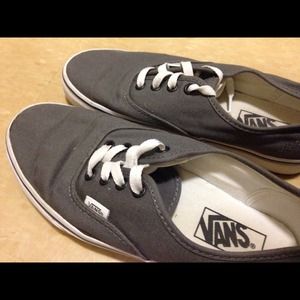 Classic dark gray vans that I've worn 6-7 times! The canvas is clean as well as the laces, and as you can see the soles show barely any wear! I can't wear these because my heels come up out of them when I walk but other than that they're comfortable and in mint condition!