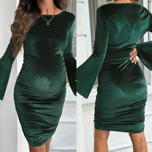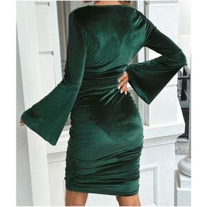 Classic Green Bell Sleeve Velvet Party Evening Holiday Dress