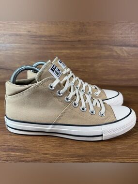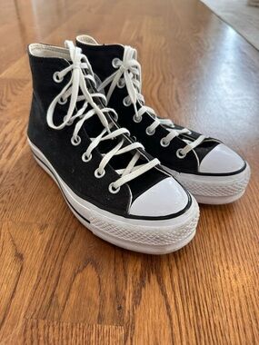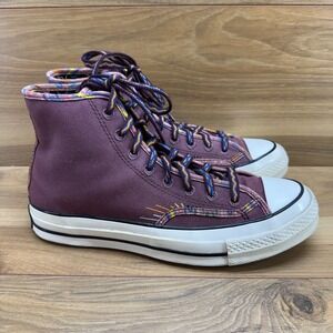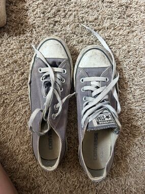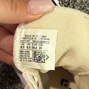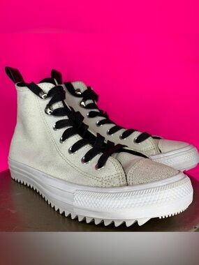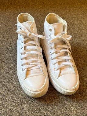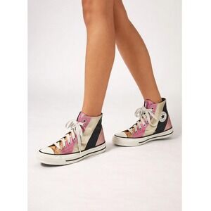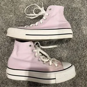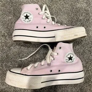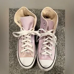 Light purple high-top canvas sneakers with white laces and rubber sole. Comfortable design for all-day wear. Versatile style that pairs well with casual outfits. Light pink color adds a soft, feminine touch.
