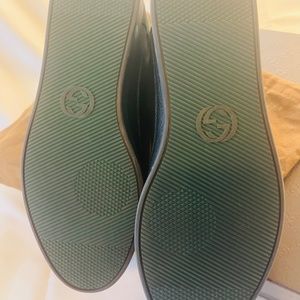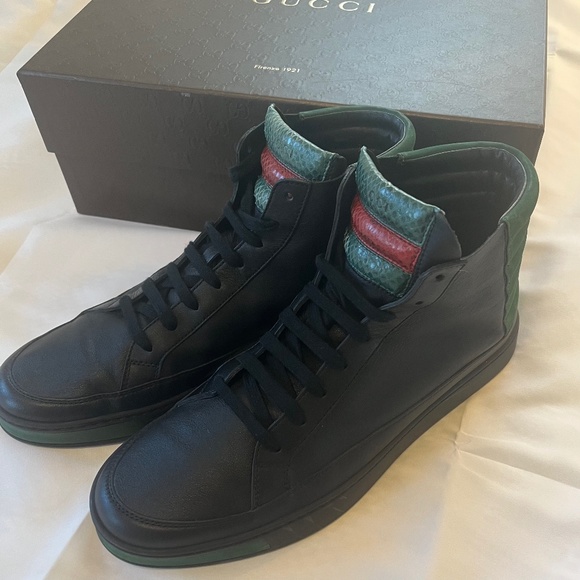 Classic Gucci! Black and green high top leather sneakers! Men’s size 9.5 with minor wear on the uppers. Great condition with the original box, dust bags and extra laces. Size updated.