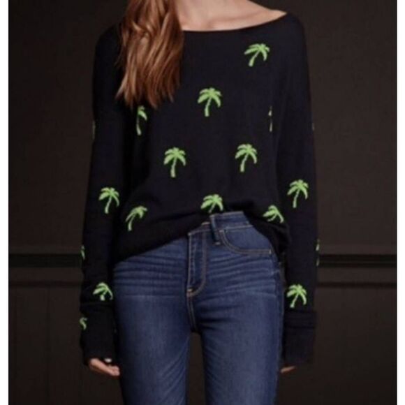 Hollister Palm Tree Print Knit Pullover Sweater in Navy Blue & Neon Green. Hollister knit sweater, deep navy blue with bright green palm trees. Warm and soft but not overly heavy. Lightly used in great condition, please see photos as they are part of the description.