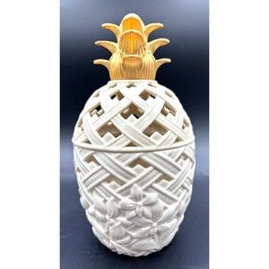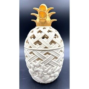 Classic Lenox Pineapple Box for Potpourri Porcelain with Sculptured Latticework Condition: Pre-owned in excellent condition. No chips, cracks, stains or crazing of any kind. Barely used and very clean. Still has the original label on the bottom. No potpourri is included in this listing. Measures 8.5" in height with topper. Please see all photos for condition. Fast & Safe Shipping