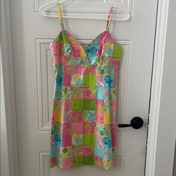 Excellent preowned condition! It is fully lined with adjustable straps, hidden zipper in back and no pockets. Charming dress with pink and green hues. Ideal for warm weather.