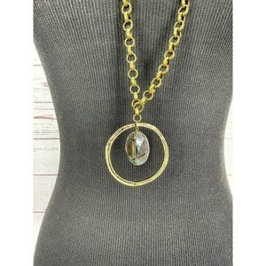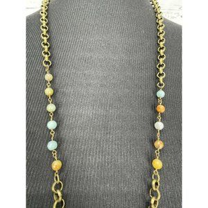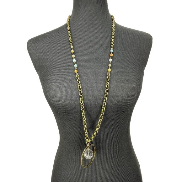 Classic Long Multi Colored Beads Antique Gold Tone Circular Clear Bead Dangling Center Pendant Necklace