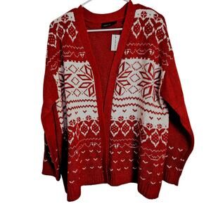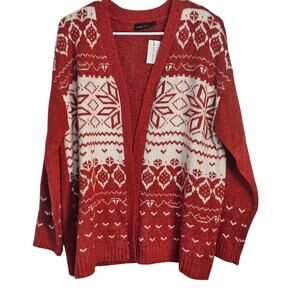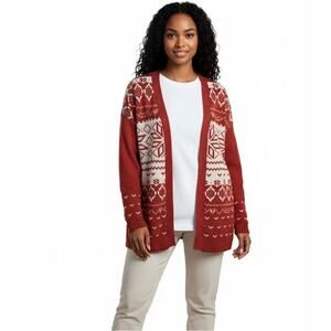 NWT-A classic fit cardigan with a perfect-for-the-season fair isle print and ribbed details -- a piece as conventionally-cozy as hot chocolate and movie marathons.
