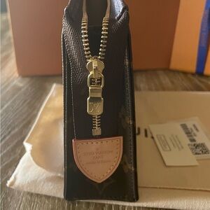 This iconic small cosmetic pouch is crafted of the classic LV monogram with a beige interior