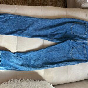 High-rise or mid-rise classic straight leg denim jeans in a medium blue wash. Features traditional five-pocket styling and a clean, versatile fit. Perfect for a casual, everyday look and easy to dress up or down. Cuffs are currently rolled but can be unrolled.