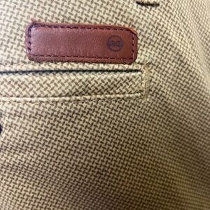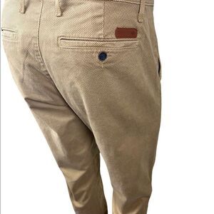 The Marshall Chino by Adriano Goldschmied, Size 33”W x 33”L, is a classic cut in high quality fabric, 97% cotton and 3% elastic, in shades of tan, khaki and brown. They are in excellent condition and feature 2 front hip pockets, 2 rear button closure pockets, and front button/zipper closure.