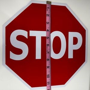 Bring a striking and recognizable touch to your home, garage, man cave, office, or dorm with this classic metal STOP sign. Measuring about 12 inches across, this sturdy octagon sign features the iconic red background and white lettering with a clean, glossy finish. Its bold design makes it a fun collectible piece or practical décor for themed spaces.