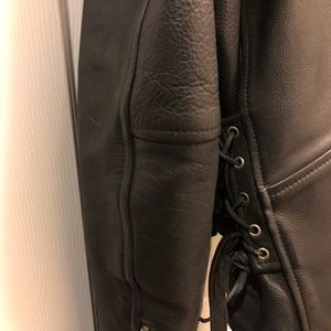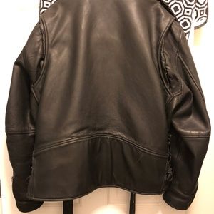 This jacket is very heavy and holds up extremely well on cold rides, I rode with it in 6 degree weather. The jacket is soft cowhide, zip out liner, dual inside pockets, outside hand warmer pockets, and upper chest zip pocket. Size is 52, I am 511, 240lbs with sleeve length of 36" , I ride a Harley Davidson touring bike and have had no issues with zippers or buckles scratching my paint. I love the jacket but my days of riding is cold weather is long gone.