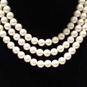 This timeless necklace features three elegant strands of white faux pearls with a radiant luster that captures the beauty of classic sophistication. The pearls measure 10mm in width, creating a bold yet graceful look. The shortest strand measures 16" in length, designed to sit perfectly at the neckline. The piece is finished with a secure gold tone hinged clasp, adding both style and function. A beautiful vintage-inspired accessory in excellent condition, perfect for formal occasions, weddings, or elevating everyday elegance.