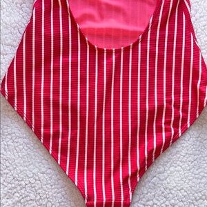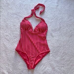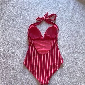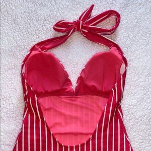 Dive into style with this one-piece swimsuit, showcasing a vibrant red and white vertical striped pattern. The halter neck tie and sweetheart neckline add a touch of elegance, while the stretchy fabric ensures a comfortable fit for any swim adventure.
