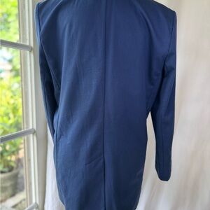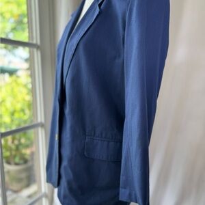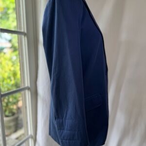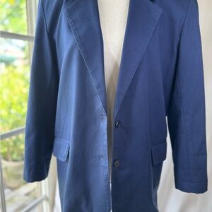 Classic navy blue blazer with shoulder pads, front side pockets and featuring a 2 button-up closure. Blazer does not have a lining. Lightweight blazer.