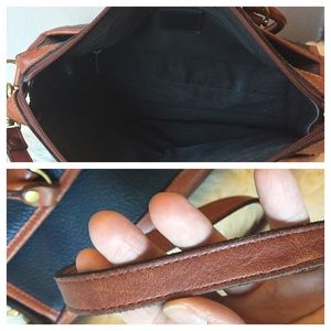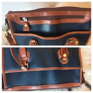 A preppy classic. Navy and brown tanned leather handbag with crossbody strap. Good used condition. We photographed the "most worn" corner, the rest looks fabulous. Recently conditioned. Unknown designer but high quality details. Would be great for your girls weekend in the Hamptons.