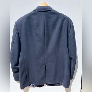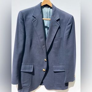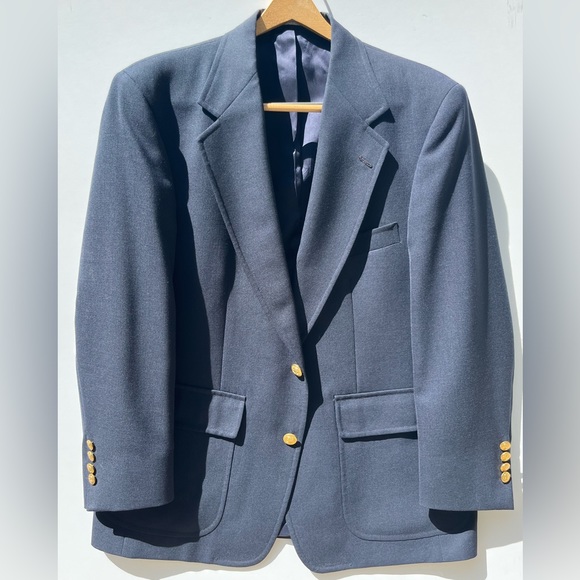 Vintage navy sport coat. Gold buttons. One owner. Partially lined. Hole in lining as shown in photo.