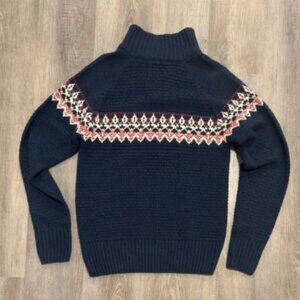 Vintage 90s red, white, and navy blue V-neck knit sweater, size large, in excellent condition with a soft, lightweight material. Features a tricolored knit with a solid button-neck waffle collar and shawl collar. Labeled as Denim Style by New Caro.