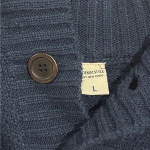 Vintage 90s red, white, and navy blue V-neck knit sweater, size large, in excellent condition with a soft, lightweight material. Features a tricolored knit with a solid button-neck waffle collar and shawl collar. Labeled as Denim Style by New Caro.