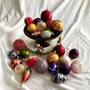 vintage Christmas ornaments, Pier Imports ornaments, 1990s holiday décor, retro Christmas, vintage holiday, collectible ornaments, glass ornaments, red and blue ornaments, gold glitter ornaments, delicate ornaments, Christmas tree decorations, holiday collectibles, vintage Pier 1 Imports