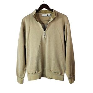 The rich, washed tan/khaki color and soft cotton-blend material (80% Cotton, 20% Polyester per the tag) give it a classic, broken-in feel right off the hanger. The pullover features a durable, high-quality metal quarter-zip closure and a mock neck collar for extra warmth. It's a versatile piece ideal for fishing, camping, or a sharp casual look.