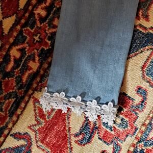 One of a kind, hand embellished,with ladybug buttons; vintage lace trim on hem and waist, heart patch, vintage doily remnants and hand embroidery.