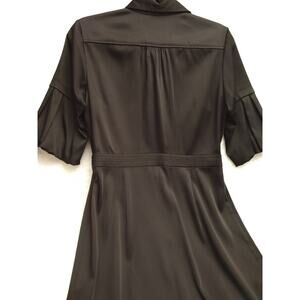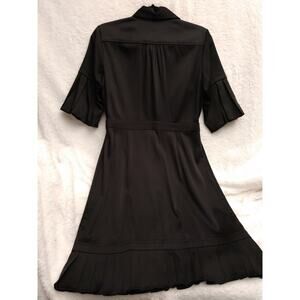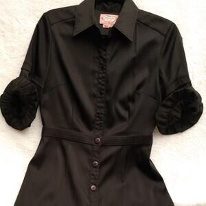 Chic, black satin cocktail dress with amazing details: front button closure, bottom pleats, form fitted waist, puff sleeves and classic collar. So appropriate for semi-formal wear. Great taste and style statement!