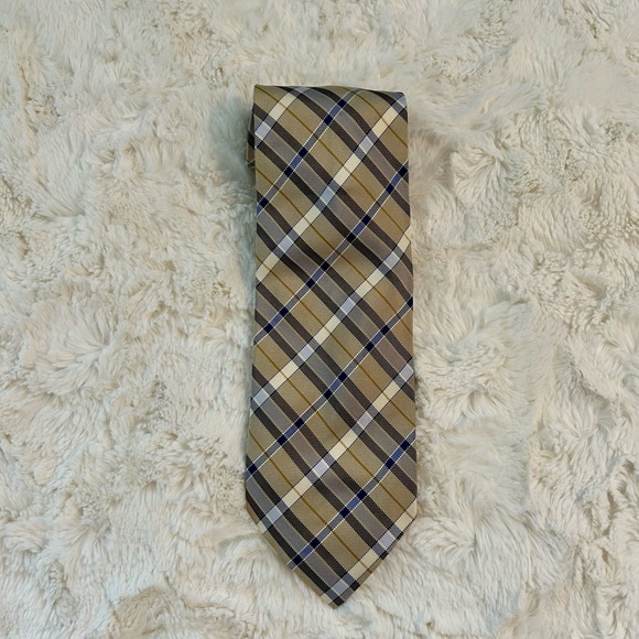 Elevate your style with this classic plaid tie. Featuring a sophisticated blend of tan, black, gold, and blue, it's perfect for any formal occasion.