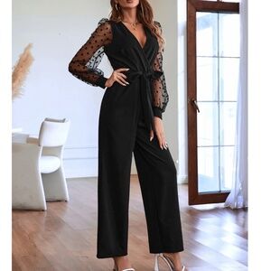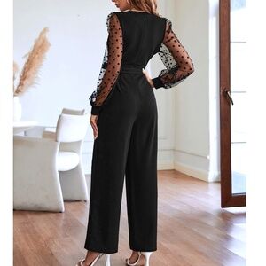 Classic Polka Dot Semi Sheer Long Sleeve Belted Straight Leg Jumpsuit