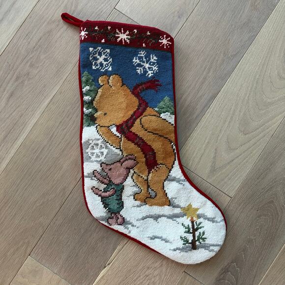 Classic Pooh & Piglet Needlepoint Christmas Stocking Snow Tree 17” Rare Disney