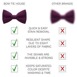 TIMELESS: The bow tie is durable, easy to use, no special cares needed. The fabric shines slightly, easily holds its shape, does not deform, is dense but soft, resistant to stains, stains are easy to remove and the bow tie does not change his size over time.