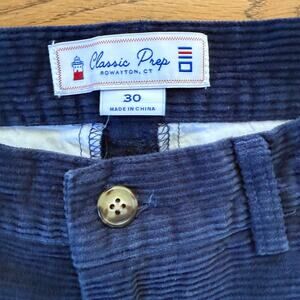 Men’s Classic Prep navy corduroy pants, size 30. These feature a horizontal corduroy texture that makes them unique and stylish. The pants are flat-front with side pockets, buttoned back pockets, and a zip fly with button closure. They are unhemmed/raw edge at the bottom, giving you the option to leave them as-is for a relaxed look or tailor them for a precise fit.