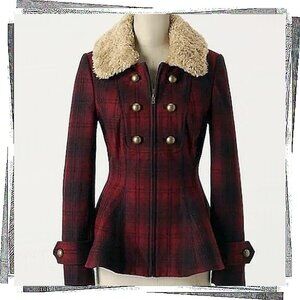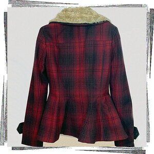 Classic red & black plaid wool blend military jacket / coat by Elevensees. Flattering peplum waist. Removable faux fur collar. Finished with military bronze buttons at chest & wrist. Zip closure. Front slant pockets. Fully lined. I wore this a bunch and it's in great condition.