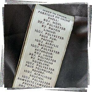 Content 60% wool, 35% poly, 5% rayon; lining 100% poly