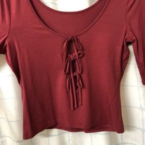 Lovely, classic Maroon/ Deep Red Guess 3/4 inch sleeve lace-up crop top. Aside from a hardly noticeable discoloration on the shoulder--I honestly didn't notice it until making this listing--it is in excellent condition. Pairs perfectly with high rise jeans and skirts. Has lace-up & bow detailing on the back as pictured. Size medium with a lot of stretch, so could fit a large comfortable as well. Please feel free to reach out with questions or to make to an offer!! <3