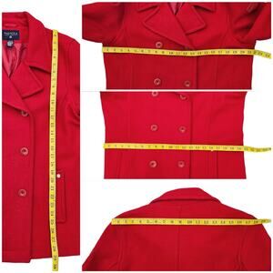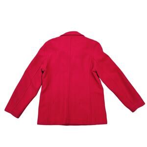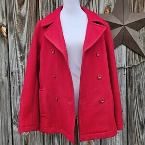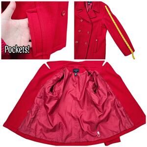 Bright solid red wool & nylon blend fabric. Double breasted, long sleeves, collar w/ large notched lapels, 2 exterior pockets, fully lined. Issues noted in photos. Good preowned condition, overall. Size Extra Large by Nautica Jeans Co. Classic styled pea coat. Listing as a Women's, but easily a unisex jacket: please see measurements for fit decisions.