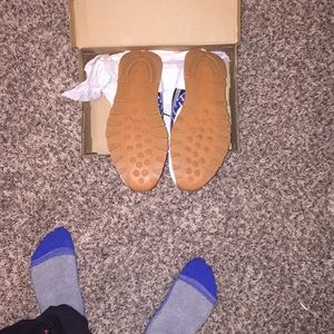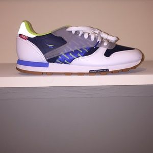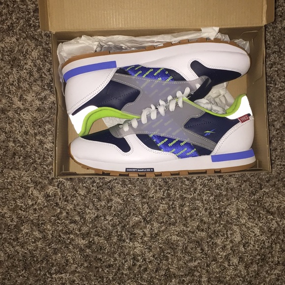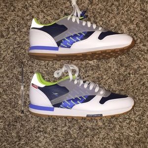 Classic Reebok leather white blue inside of shoe green sole blue never worn unisex