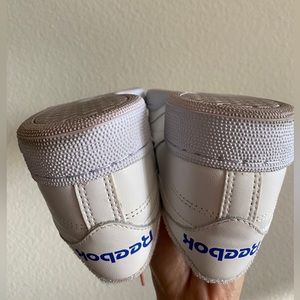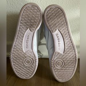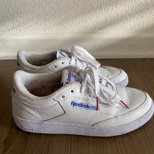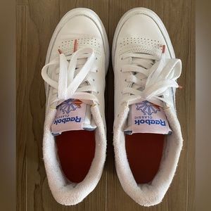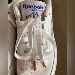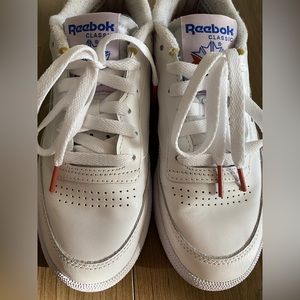 Classic Reeboks with a slight purple sole. Excellent condition they are like new and have been worn less than 3 times. White with blue & purple detailing on logo design of the tongue and magenta colored lace tips. I’m a true 6.5 and they fit perfectly! Love these but don’t have the right wardrobe to style.