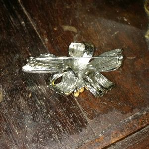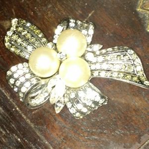 Vintage looking ribbon like pin with a silver metallic finish with lines of round rhinestones and marquise shaped ones gathered around 3 large pearls in the center. Very pretty pin missing a few stones but not to noticeable still in great shape.