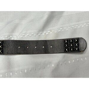 This vintage belt features classic black leather adorned with metal studs, offering a bold style statement. Its adjustable length ensures versatility. Classic rocker triple pyramid studded belt. Center section embellished with 3 lines of pyramid studs, silver metal studs, black and silver. See pictures for signs of wear.