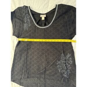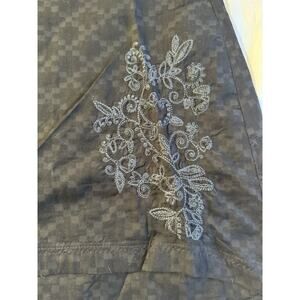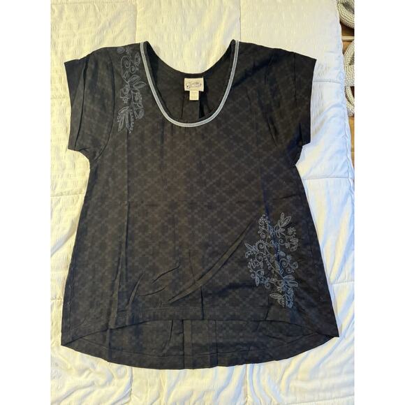 This Classic Romantic blouse is a must-have for any fashion-forward woman's wardrobe. Made from 100% cotton, this black and blue/gray floral embroidered shirt is perfect for any occasion. The short-sleeved blouse features a round neckline and is a size L. The shirt is designed with a beautiful floral pattern and is accented with embroidery, making it a unique and stylish addition to any outfit. This blouse is perfect for any woman who wants to add a touch of romance to her wardrobe.