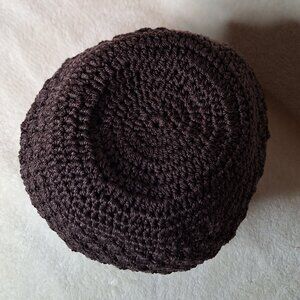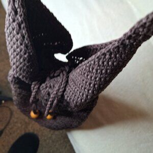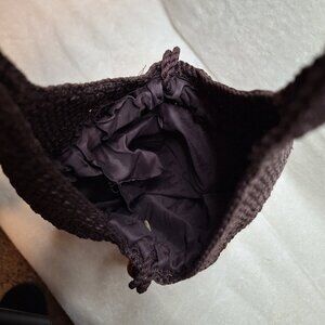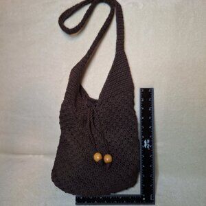 Classic Nylon Rope Weave Sinch Shoulder Handbag with Nylon Lining and Large Wooden Beads on Sinch Cords ~ Color: Dark Brown. Could be used for Festivals, Beach or Pool or just out and about.