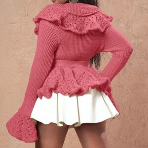 Classic Ruffle Detail Bell Sleeve Belted Knit Cardigan Sweater