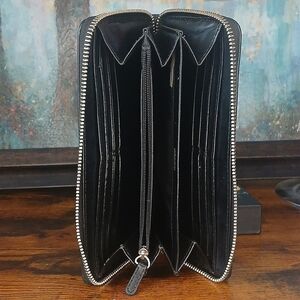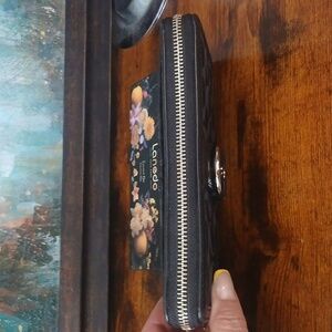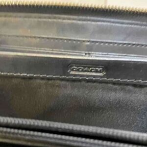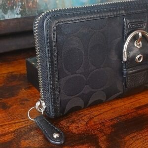 Stylish Coach wallet in black with a buckle detail. Perfect for everyday use. zippered closure. classic signature C jaquard fabric style. card holder slots, zippered coin pockets, bill slots. checkbook sized. pre loved great condition- has minimal peeling see pics.