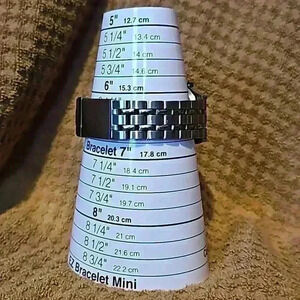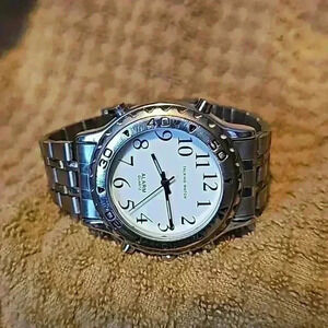 This is a unisex silver and gold toned talking watch in a linked metal bracelet. It has a locking clasp and alarm feature. The band measures approx 6.75" when locked. It has quartz movement and glow-in-the-dark hands with rotating bezel. This is a classic looking timepiece and is a great accessory from an informal meeting to dinner with friends.