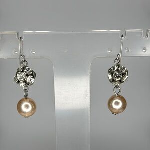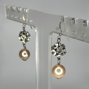 These earrings showcase a sophisticated blend of silver and cream tones, featuring a crystal-encrusted sphere paired with a lustrous cream pearl. The elegant design is completed with silver fish hook ear wires, making them perfect for both casual and formal occasions.