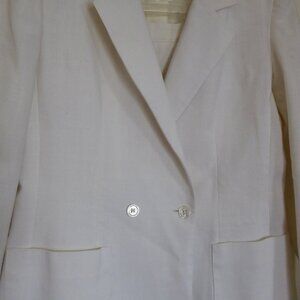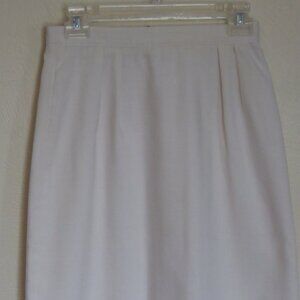 Beautiful off white 2 piece fully lined suit from Jones New York size 10. Fully lined skirt is pencil style and has 2 pleats above each hip for nice fit. Back zipper. Skirt is 28 inches from waist to hem and sits at natural waist. Jacket is full sleeve length with 3 buttons on each sleeve. Has 2 button front closure and patch pockets that go to bottom of hem. Looks every classic.