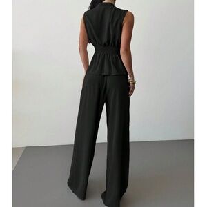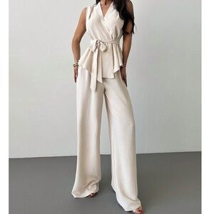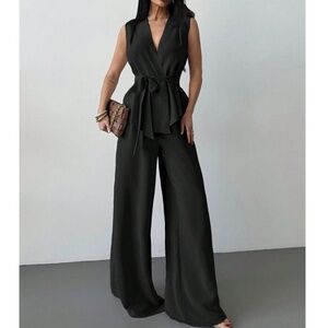 Classic Surplice Sleeveless Belted Blouse Wide leg Pants