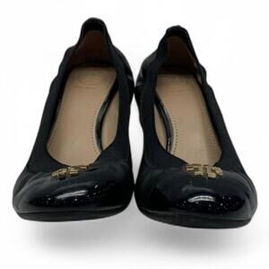 Classic Tory Burch Black Patent Leather Gold Logo Ballet Wedges Capsule Chic 5