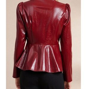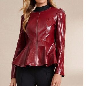 Classic Vegan Leather Zip up Puff Sleeve Flared Hem Jacket